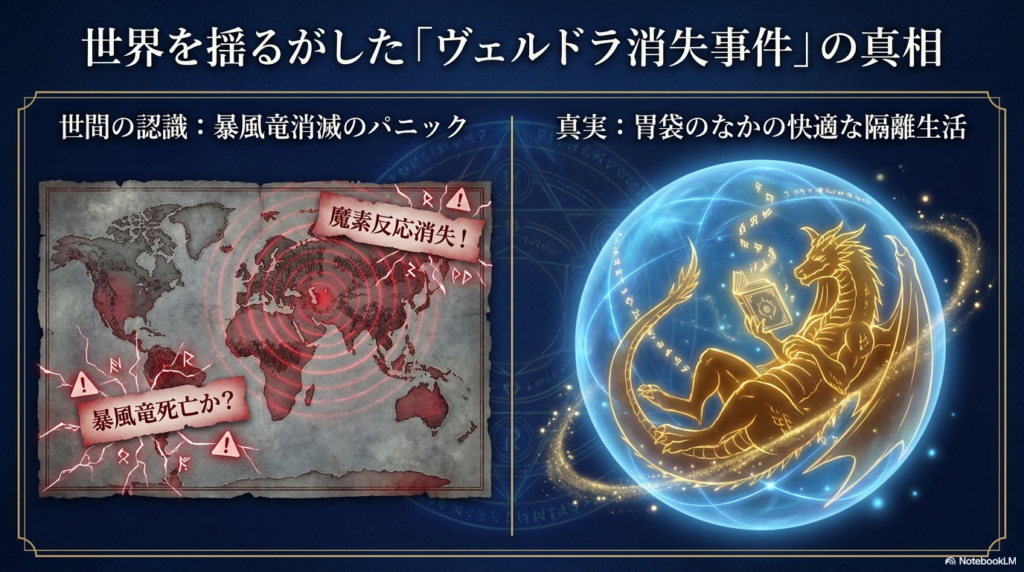 第1話で、リムルがヴェルドラを「捕食者」で体内に取り込んだ際、世界中からヴェルドラの気配(魔素反応)がパタリと消えてしまいました。これによって、各国の調査機関は「暴風竜ヴェルドラが消滅した(死亡した)」と判断したんです。