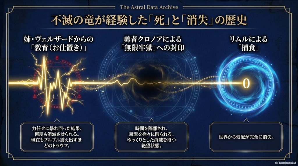 実はヴェルドラ、過去に何度も「死」を経験しています。その犯人は、彼のお姉さんである「白氷竜」ヴェルザードです。昔のヴェルドラは今以上にやんちゃで、力任せに暴れ回っていたため、秩序を重んじる姉に「教育(お仕置き)」として何度も消滅させられていたんですよ。