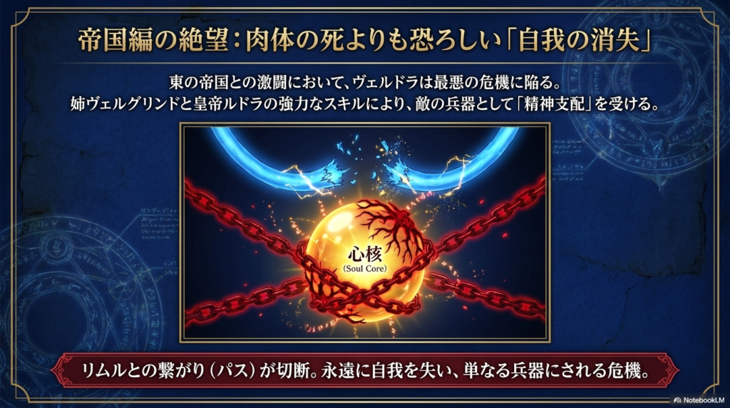 この時、リムルとヴェルドラを繋いでいたパスが切れてしまい、リムルはヴェルドラを奪われた怒りで限界を超えます。最終的には、リムルがヴェルドラを「再度捕食」して支配を上書きすることで救出に成功しますが、一歩間違えれば永遠に自我を失っていたかもしれない、シリーズ屈指のピンチでした。