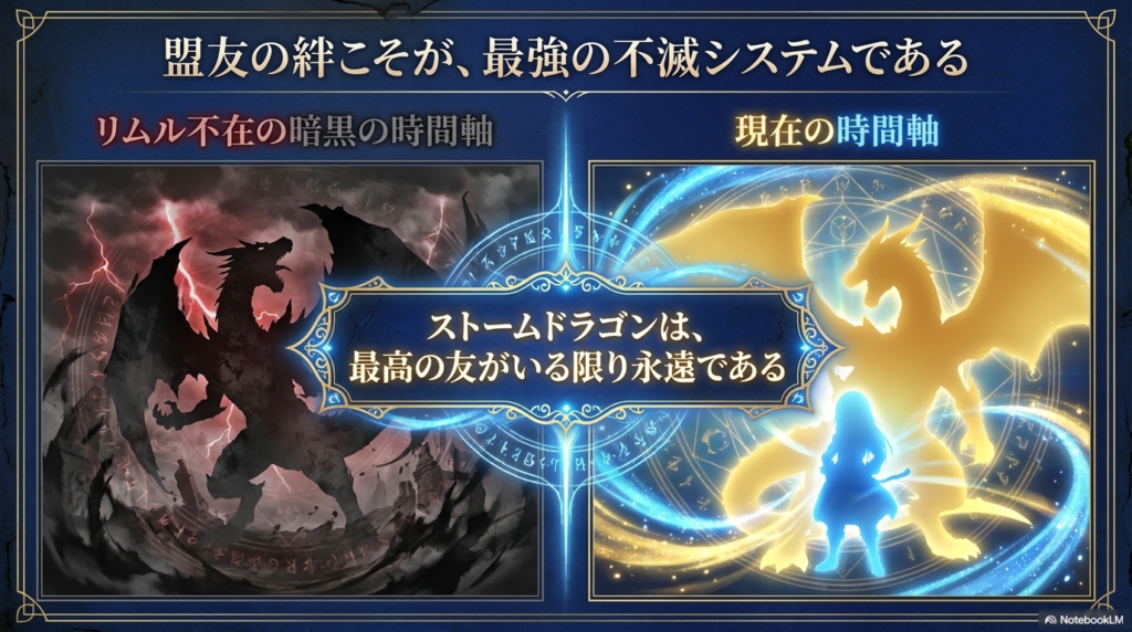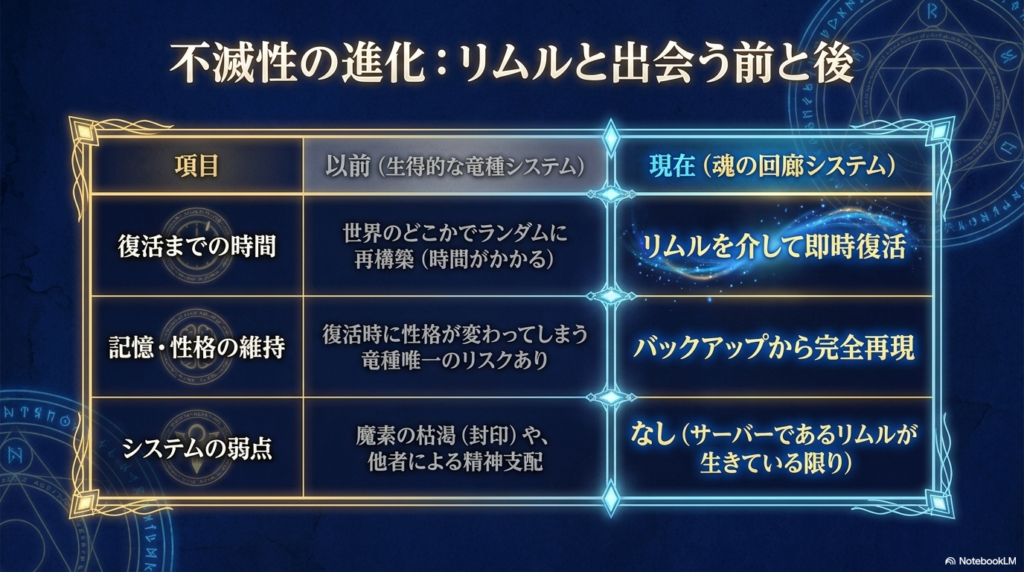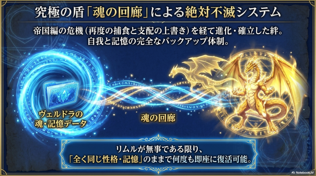 この事件の後、リムルとヴェルドラの絆はさらに進化し、「魂の回廊」という特別な繋がりが確立されました。これによって、ヴェルドラの記憶や魂のデータは常にリムルの中にバックアップされるようになります。
